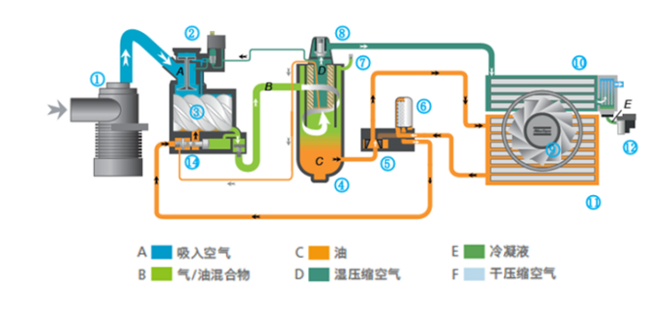通过进气过滤器(1)和进气阀(2)吸入的空气在压缩机主机(3)中被压缩。压缩空气和油的混合物将流入空气/油分离器(4),从而将油和空气分隔开来。空气流经小压力阀(8)、空气冷却器(10),在冷却器中进行冷却和水气分离,分离的冷凝水进入自动排污阀(12),干燥的空气进入排气阀。小压力阀(8)可以防止空气/油分离器(4)中压力低于小压力,且包含一个可以防止压缩空气从管网倒流的单向阀。