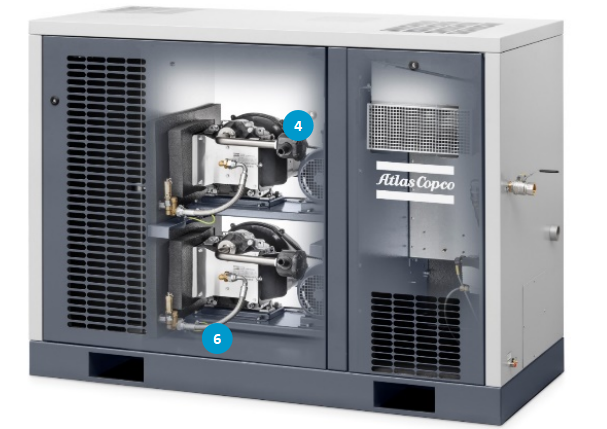 整个机组都放置在一个隔音箱内,使其限制噪音水平,可低至53 dB(A)(四周1米),允许被安装在更接近用气点的地方使用。