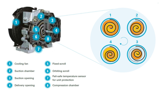 空气压缩过程由一个定涡旋盘和一个动涡旋盘相互作用而发生。进口空气进入涡旋转子外部的压缩腔,一旦空气被吸入,动涡旋盘封闭进气口。