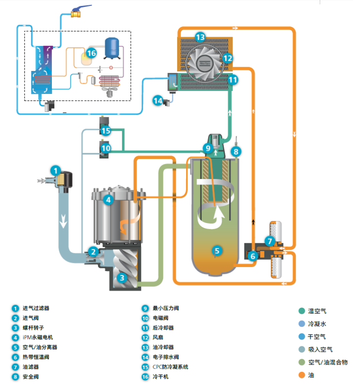 空气/油混合物通过空气/油分离器(5)的离心运动分离出大部分油,油收集在空气/油分离器(5)的下半部分,这可以充当一个油箱。油分离器中的空气压力推动油经过热带恒温阀(6),油冷却器(12),油滤器(7), 经过过滤的油通过永磁 (IPM) 电动机(4)的内部冷却通道流至压缩机主机(3),润滑油在压缩过程中发挥冷却压缩空气,密封并润滑转子的作用。