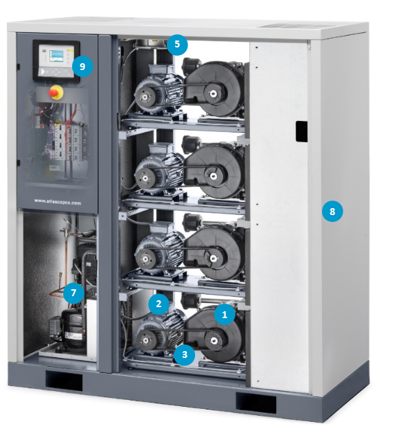 整个机组都放置在一个隔音箱内,使其限制噪音水平,可低至53 dB(A)(四周1米),允许被安装在更接近用气点的地方使用。